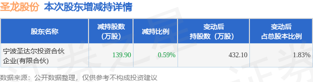 证券之星消息,10月22日圣龙股份发布公告《圣龙股份:圣龙股份关于控股股东及其一致行动人权益变动触及1%刻度的提示性公告》,其股东宁波圣达尔投资合伙企业(有限合伙)于2025年10月21日至2025年10月22日间合计减持139.9万股,占公司目前总股本的0.5918%,变动期间该股股价下跌3.26%,截止10月22日收盘报20.45元。