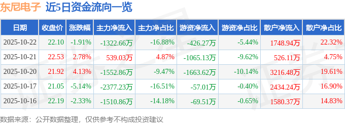 10月22日的资金流向数据方面,主力资金净流出1322.66万元,占总成交额16.88%,游资资金净流出426.27万元,占总成交额5.44%,散户资金净流入1748.94万元,占总成交额22.32%。