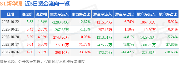 证券之星消息,截至2025年10月22日收盘,ST新华锦(600735)报收于5.33元,下跌1.84%,换手率7.9%,成交量33.61万手,成交额1.8亿元。