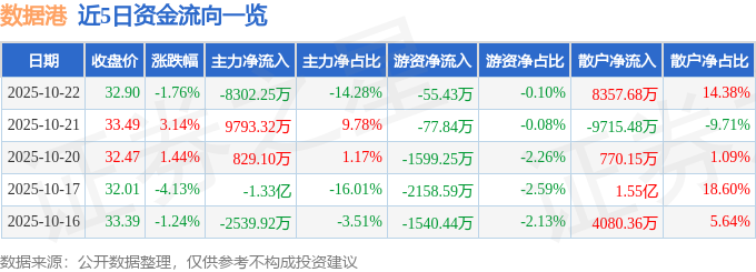 证券之星消息,截至2025年10月22日收盘,数据港(603881)报收于32.9元,下跌1.76%,换手率2.45%,成交量17.58万手,成交额5.81亿元。