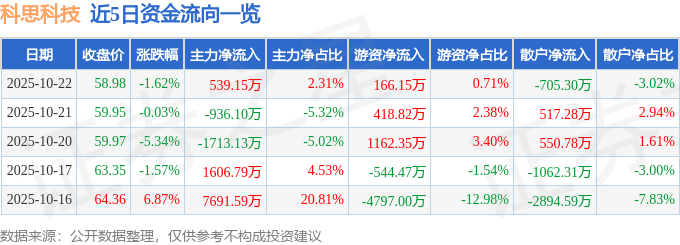 证券之星消息,截至2025年10月22日收盘,科思科技(688788)报收于58.98元,下跌1.62%,换手率2.54%,成交量3.98万手,成交额2.34亿元。