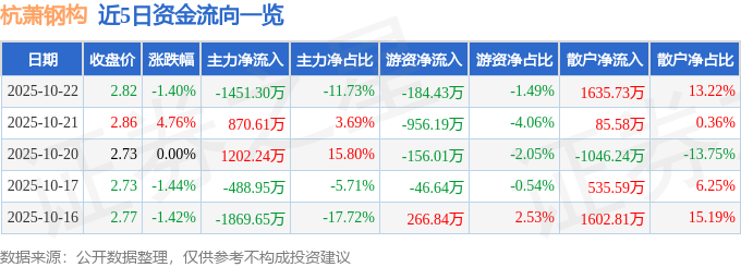 证券之星消息,截至2025年10月22日收盘,杭萧钢构(600477)报收于2.82元,下跌1.4%,换手率1.84%,成交量43.66万手,成交额1.24亿元。
