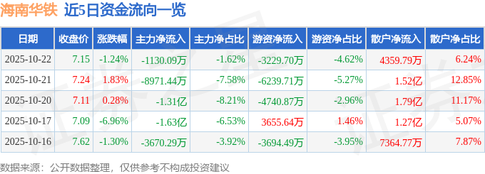证券之星消息,截至2025年10月22日收盘,海南华铁(603300)报收于7.15元,下跌1.24%,换手率4.87%,成交量97.17万手,成交额6.99亿元。