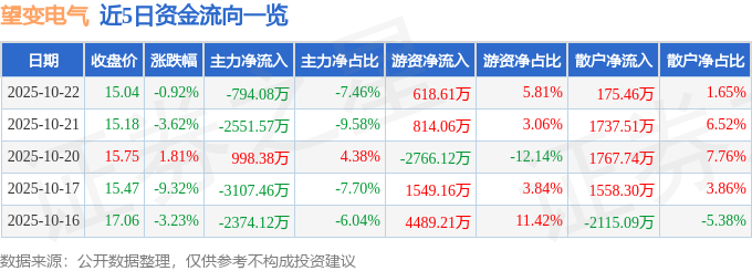证券之星消息,截至2025年10月22日收盘,望变电气(603191)报收于15.04元,下跌0.92%,换手率2.14%,成交量7.05万手,成交额1.06亿元。