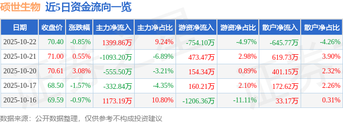 证券之星消息,截至2025年10月22日收盘,硕世生物(688399)报收于70.4元,下跌0.85%,换手率2.57%,成交量2.15万手,成交额1.52亿元。