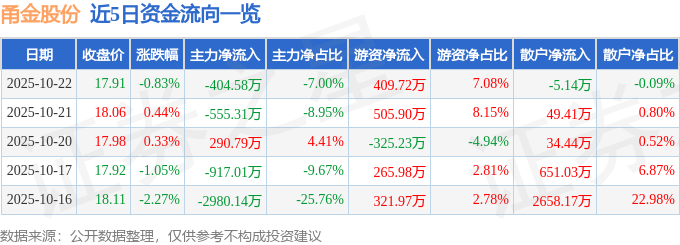 10月22日的资金流向数据方面,主力资金净流出404.58万元,占总成交额7.0%,游资资金净流入409.72万元,占总成交额7.08%,散户资金净流出5.14万元,占总成交额0.09%。