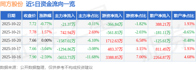 证券之星消息,截至2025年10月22日收盘,同方股份(600100)报收于7.72元,下跌0.77%,换手率0.78%,成交量26.05万手,成交额2.01亿元。