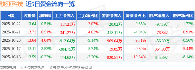 证券之星消息,截至2025年10月22日收盘,骏亚科技(603386)报收于13.64元,下跌0.51%,换手率1.27%,成交量4.13万手,成交额5657.68万元。