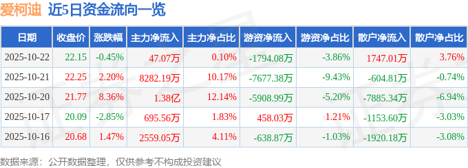 证券之星消息,截至2025年10月22日收盘,爱柯迪(600933)报收于22.15元,下跌0.45%,换手率2.14%,成交量20.88万手,成交额4.65亿元。