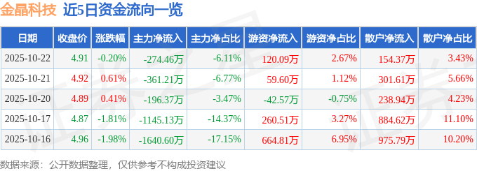 10月22日的资金流向数据方面,主力资金净流出274.46万元,占总成交额6.11%,游资资金净流入120.09万元,占总成交额2.67%,散户资金净流入154.37万元,占总成交额3.43%。