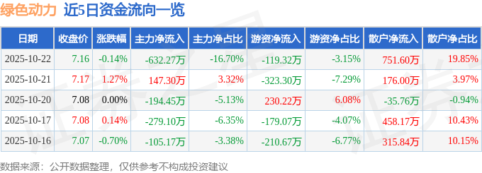 证券之星消息,截至2025年10月22日收盘,绿色动力(601330)报收于7.16元,下跌0.14%,换手率0.53%,成交量5.27万手,成交额3785.91万元。