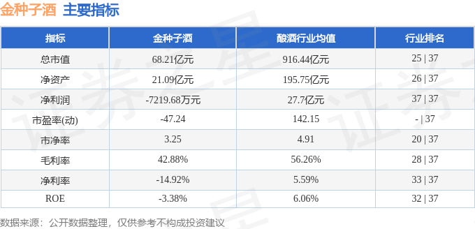 金种子酒2025年中报显示,公司主营收入4.84亿元,同比下降27.47%;归母净利润-7219.68万元,同比下降750.54%;扣非净利润-7752.45万元,同比下降2226.38%;其中2025年第二季度,公司单季度主营收入1.88亿元,同比下降24.16%;单季度归母净利润-3326.91万元,同比下降408.17%;单季度扣非净利润-3694.08万元,同比下降229.98%;负债率31.63%,财务费用218.41万元,毛利率42.88%。金种子酒(600199)主营业务:主要从事白酒生产和销售业务。