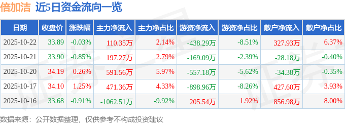 证券之星消息,截至2025年10月22日收盘,倍加洁(603059)报收于33.89元,下跌0.03%,换手率1.51%,成交量1.52万手,成交额5152.15万元。