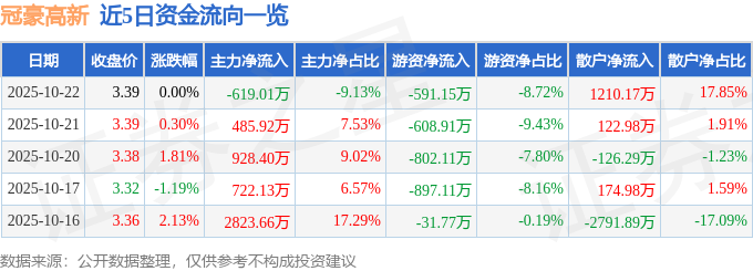 10月22日的资金流向数据方面,主力资金净流出619.01万元,占总成交额9.13%,游资资金净流出591.15万元,占总成交额8.72%,散户资金净流入1210.17万元,占总成交额17.85%。