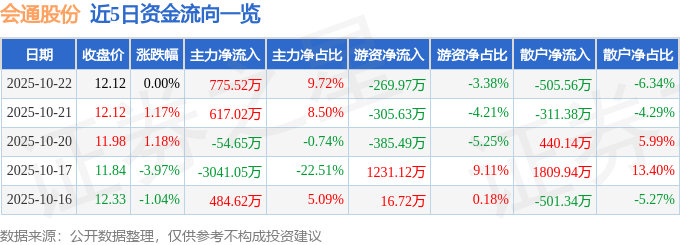 证券之星消息,截至2025年10月22日收盘,会通股份(688219)报收于12.12元,上涨0.0%,换手率1.2%,成交量6.58万手,成交额7976.4万元。
