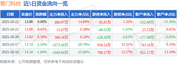 证券之星消息,截至2025年10月22日收盘,普门科技(688389)报收于13.88元,上涨0.0%,换手率0.58%,成交量2.49万手,成交额3468.41万元。