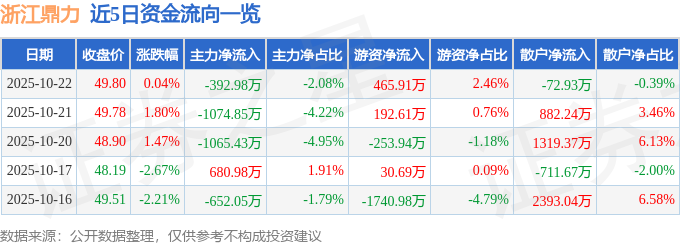 证券之星消息,截至2025年10月22日收盘,浙江鼎力(603338)报收于49.8元,上涨0.04%,换手率0.75%,成交量3.79万手,成交额1.89亿元。