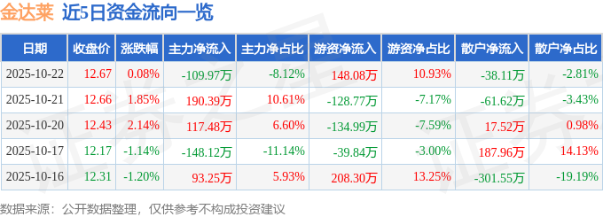 证券之星消息,截至2025年10月22日收盘,金达莱(688057)报收于12.67元,上涨0.08%,换手率0.39%,成交量1.07万手,成交额1354.9万元。