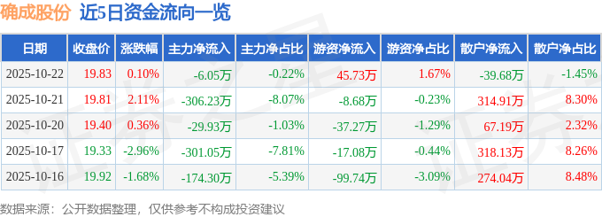 证券之星消息,截至2025年10月22日收盘,确成股份(605183)报收于19.83元,上涨0.1%,换手率0.33%,成交量1.38万手,成交额2742.23万元。