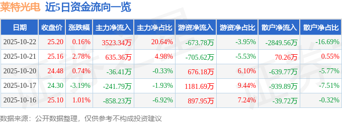 证券之星消息,截至2025年10月22日收盘,莱特光电(688150)报收于25.2元,上涨0.16%,换手率1.7%,成交量6.83万手,成交额1.71亿元。