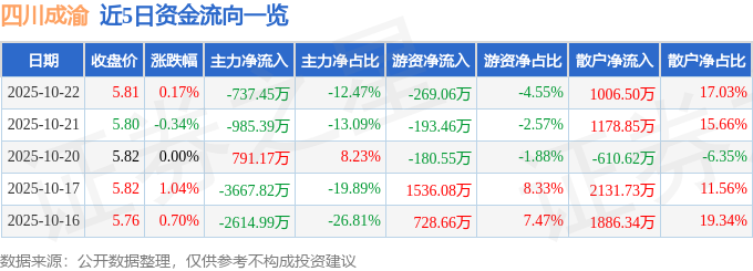 证券之星消息,截至2025年10月22日收盘,四川成渝(601107)报收于5.81元,上涨0.17%,换手率0.47%,成交量10.15万手,成交额5911.66万元。