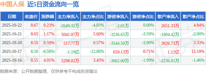 证券之星消息,截至2025年10月22日收盘,中国人保(601319)报收于8.67元,上涨0.23%,换手率0.18%,成交量63.34万手,成交额5.48亿元。