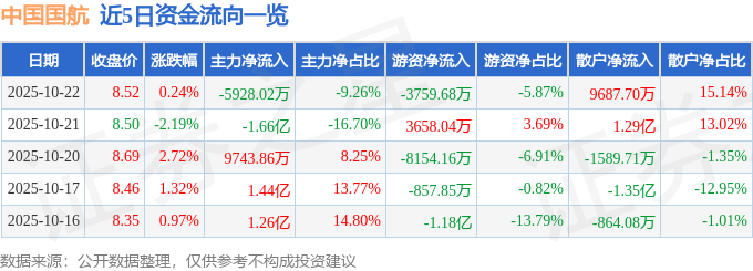 证券之星消息,截至2025年10月22日收盘,中国国航(601111)报收于8.52元,上涨0.24%,换手率0.65%,成交量75.1万手,成交额6.4亿元。