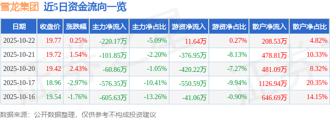 证券之星消息,截至2025年10月22日收盘,雪龙集团(603949)报收于19.77元,上涨0.25%,换手率1.04%,成交量2.18万手,成交额4325.28万元。