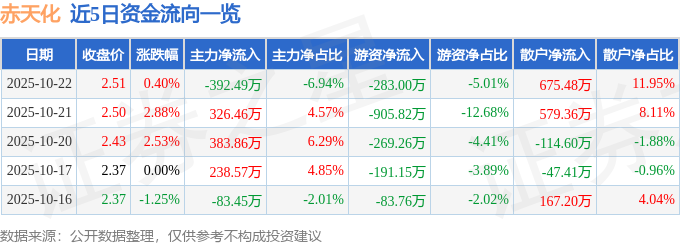 证券之星消息,截至2025年10月22日收盘,赤天化(600227)报收于2.51元,上涨0.4%,换手率1.76%,成交量22.53万手,成交额5651.78万元。