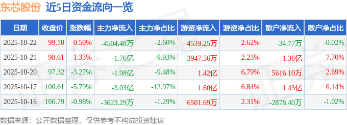 证券之星消息,截至2025年10月22日收盘,东芯股份(688110)报收于99.1元,上涨0.5%,换手率3.98%,成交量17.62万手,成交额17.3亿元。
