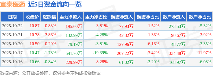 证券之星消息,截至2025年10月22日收盘,宣泰医药(688247)报收于10.87元,上涨0.83%,换手率1.04%,成交量4.73万手,成交额5136.92万元。