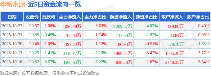 证券之星消息,截至2025年10月22日收盘,华新水泥(600801)报收于20.57元,上涨1.08%,换手率1.09%,成交量14.65万手,成交额3.0亿元。
