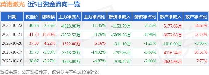 证券之星消息,截至2025年10月22日收盘,英诺激光(301021)报收于40.76元,下跌2.25%,换手率5.72%,成交量8.7万手,成交额3.54亿元。