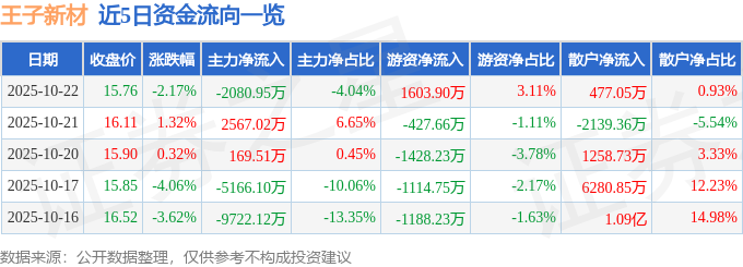 证券之星消息,截至2025年10月22日收盘,王子新材(002735)报收于15.76元,下跌2.17%,换手率11.51%,成交量32.28万手,成交额5.15亿元。