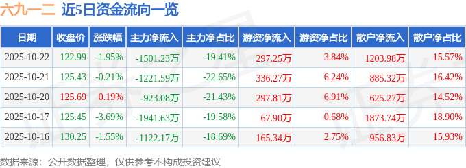 证券之星消息,截至2025年10月22日收盘,六九一二(301592)报收于122.99元,下跌1.95%,换手率3.58%,成交量6267.0手,成交额7735.13万元。