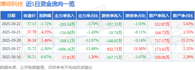 证券之星消息,截至2025年10月22日收盘,博硕科技(300951)报收于37.13元,下跌1.72%,换手率0.99%,成交量1.49万手,成交额5558.98万元。