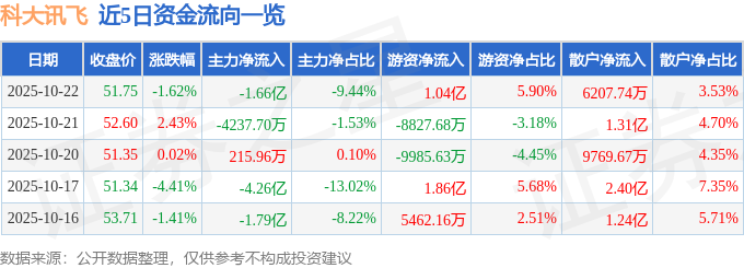 证券之星消息,截至2025年10月22日收盘,科大讯飞(002230)报收于51.75元,下跌1.62%,换手率1.55%,成交量33.89万手,成交额17.58亿元。
