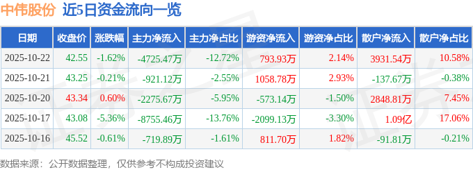 证券之星消息,截至2025年10月22日收盘,中伟股份(300919)报收于42.55元,下跌1.62%,换手率0.96%,成交量8.74万手,成交额3.71亿元。