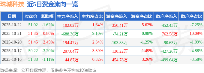 证券之星消息,截至2025年10月22日收盘,珠城科技(301280)报收于51.02元,下跌1.62%,换手率3.2%,成交量1.22万手,成交额6238.73万元。