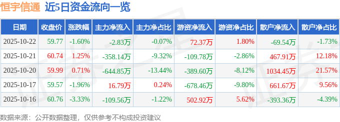 证券之星消息,截至2025年10月22日收盘,恒宇信通(300965)报收于59.77元,下跌1.6%,换手率1.2%,成交量6698.0手,成交额4027.97万元。