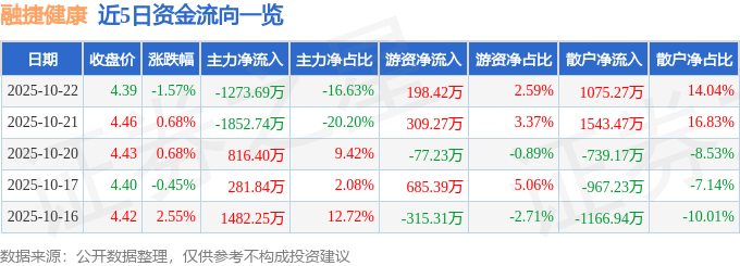 证券之星消息,截至2025年10月22日收盘,融捷健康(300247)报收于4.39元,下跌1.57%,换手率2.15%,成交量17.31万手,成交额7660.64万元。