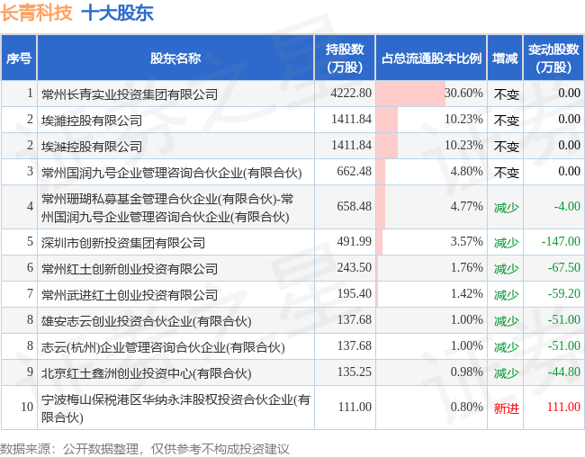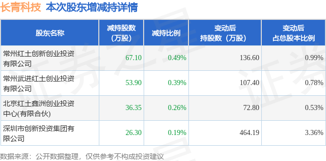 证券之星消息,10月22日长青科技发布公告《长青科技:关于合计持股5%以上股东及其一致行动人权益变动触及1%整数倍的公告》,其股东常州红土创新创业投资有限公司、常州武进红土创业投资有限公司、北京红土鑫洲创业投资中心(有限合伙)、深圳市创新投资集团有限公司于2025年9月9日至2025年10月22日间合计减持183.65万股,占公司目前总股本的1.3308%,变动期间该股股价下跌0.3%,截止10月22日收盘报20.17元。