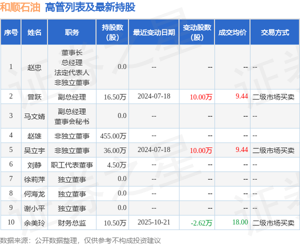证券之星消息,根据10月22日市场公开信息、上市公司公告及交易所披露数据整理,和顺石油(603353)最新董监高及相关人员股份变动情况:2025年10月21日公司高级管理人员余美玲共减持公司股份2.62万股,占公司总股本为0.0152%。变动期间公司股价上涨1.18%,10月21日当日收盘报17.96元。