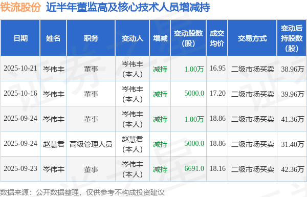 铁流股份近半年内的董监高及核心技术人员增减持详情如下: