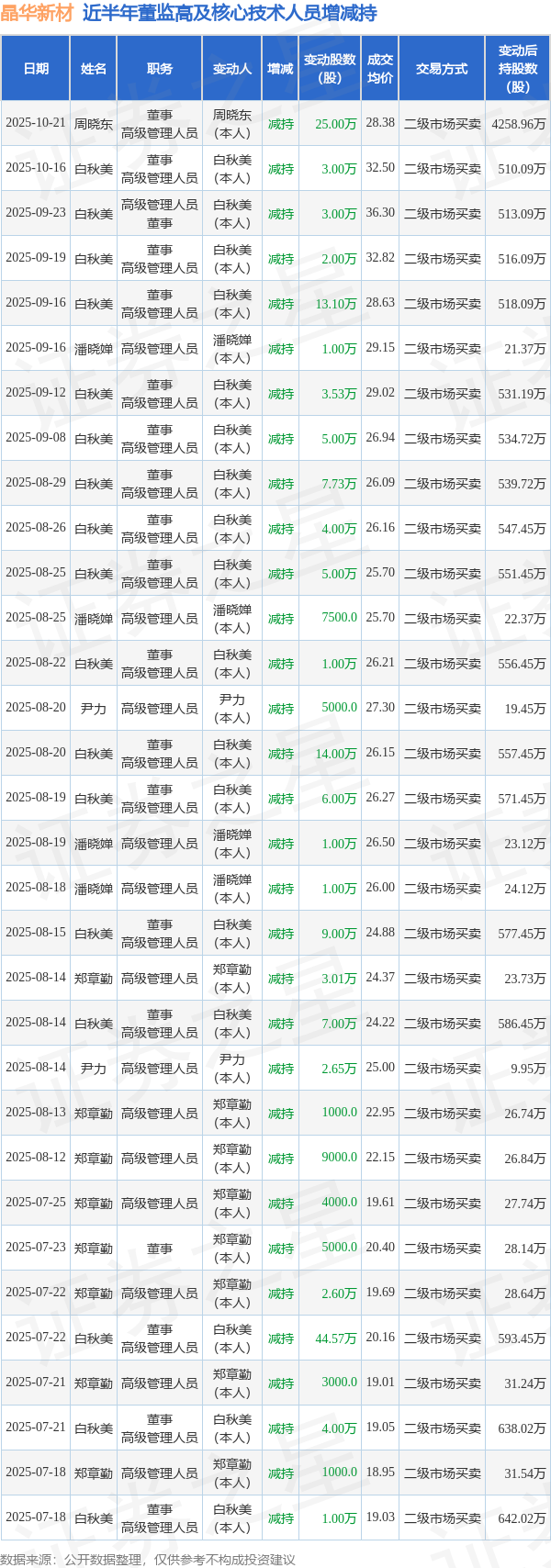 晶华新材近半年内的董监高及核心技术人员增减持详情如下: