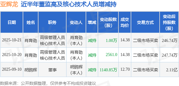 证券之星消息,根据10月22日市场公开信息、上市公司公告及交易所披露数据整理,亚辉龙(688575)最新董监高及相关人员股份变动情况:2025年10月21日公司高级管理人员,核心技术人员肖育劲共减持公司股份1.0万股,占公司总股本为0.0018%。变动期间公司股价上涨0.63%,10月21日当日收盘报14.42元。