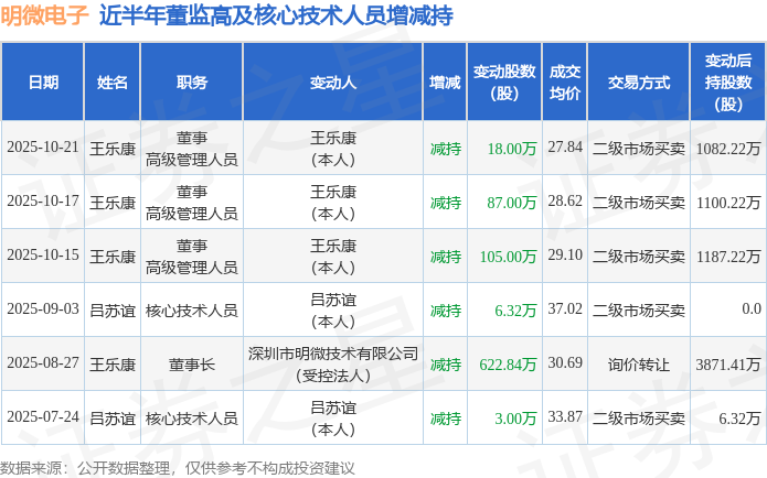 明微电子近半年内的董监高及核心技术人员增减持详情如下: