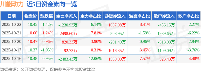 证券之星消息,截至2025年10月22日收盘,川能动力(000155)报收于10.45元,下跌1.42%,换手率1.04%,成交量19.12万手,成交额2.01亿元。