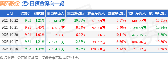 证券之星消息,截至2025年10月22日收盘,黑猫股份(002068)报收于9.83元,下跌1.21%,换手率1.27%,成交量9.32万手,成交额9166.38万元。