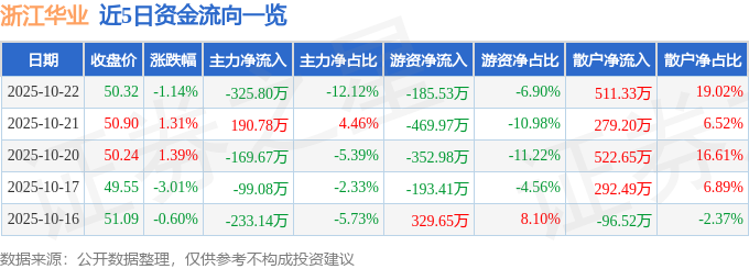 证券之星消息,截至2025年10月22日收盘,浙江华业(301616)报收于50.32元,下跌1.14%,换手率2.66%,成交量5316.0手,成交额2687.96万元。
